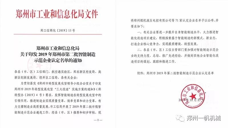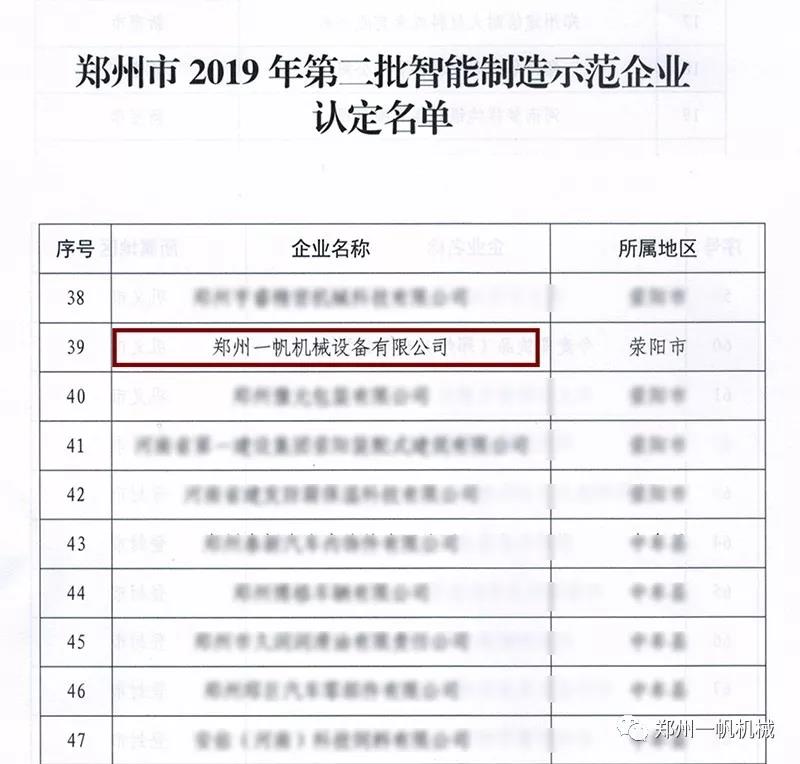 近日,鄭州市工業(yè)和信息化局傳來喜訊,鄭州一帆機械設(shè)備有限公司入選“2019年鄭州市第二批智能制造示范企業(yè)認定”名單,成為鄭州市2019年被認定的“智能制造示范企業(yè)”。