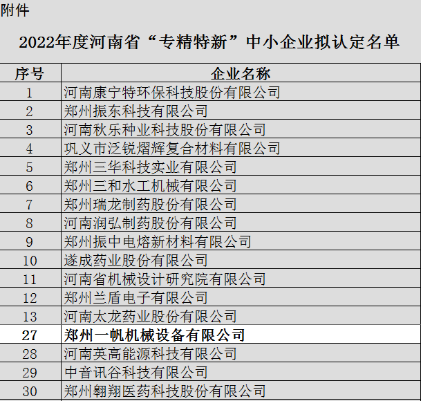 根據(jù)《河南省工業(yè)和信息化廳關(guān)于組織開展2022年度河南省“專精特新”中小企業(yè)認(rèn)定工作的通知》,經(jīng)企業(yè)自愿申報(bào),各地工業(yè)和信息化主管部門初審?fù)扑],省工業(yè)和信息化廳組織專家評(píng)審認(rèn)定,鄭州一帆機(jī)械設(shè)備有限公司憑借專業(yè)的技術(shù)與研發(fā)能力成功入選2022年度河南省“專精特新”企業(yè)名單。