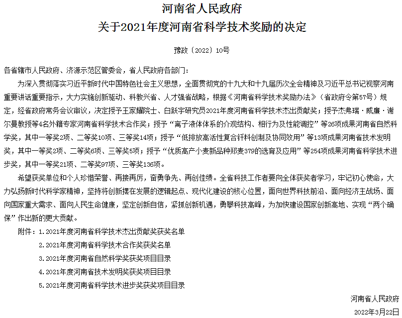 2022年3月31日,河南省人民政府發(fā)布了《關(guān)于2021年底河南省科學(xué)技術(shù)獎(jiǎng)勵(lì)的決定》,為深入貫徹落實(shí)習(xí)近平新時(shí)代中國特色社會(huì)主義思想,全面貫徹黨的十九大和十九屆歷次全會(huì)精神及習(xí)近平總書記視察河南重要講話重要指示,大力實(shí)施創(chuàng)新驅(qū)動(dòng)、科教興省、人才強(qiáng)省戰(zhàn)略,根據(jù)《河南省科學(xué)技術(shù)獎(jiǎng)勵(lì)辦法》(省政府令第57號(hào))規(guī)定,召開河南省政府常務(wù)會(huì)議進(jìn)行審議