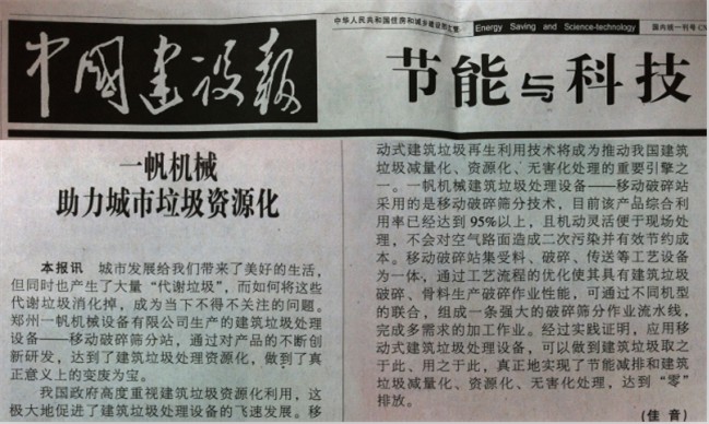 導(dǎo)讀: 建筑垃圾可以資源化回收利用已經(jīng)不是什么新聞,據(jù)中國建設(shè)報(bào)報(bào)道稱,我國城市建筑垃圾在鄭州一帆機(jī)械設(shè)備有限公司建筑垃圾處理設(shè)備的帶動(dòng)下得到了良好的回收利用。